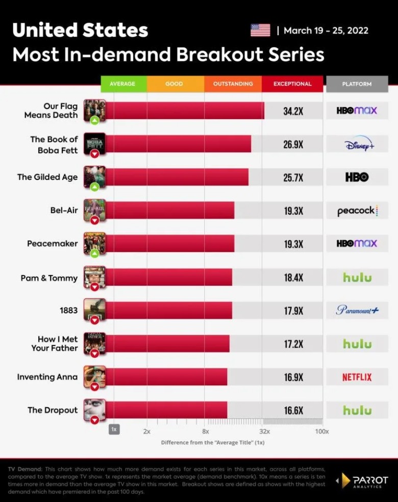 As per the numbers run by Parrot Analytics, the demand for "Our Flag Means Death" surged by 33% since its season finale premiered on March 24, 2022. Parrot Analytics runs its calculations by taking consumer research data, streaming, downloads, and social media into account, among other consumer engagement metrics. However, per the details of the metrics, the calculations only apply to the U.S. alone. Check out the details of the metrics for the week below: